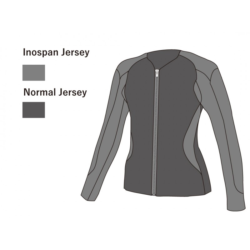 The exterior of this wetsuit neoprene jacket is covered with Inospan Jersey, which has superb durability, and 5 times the stretchability of normal jersey.